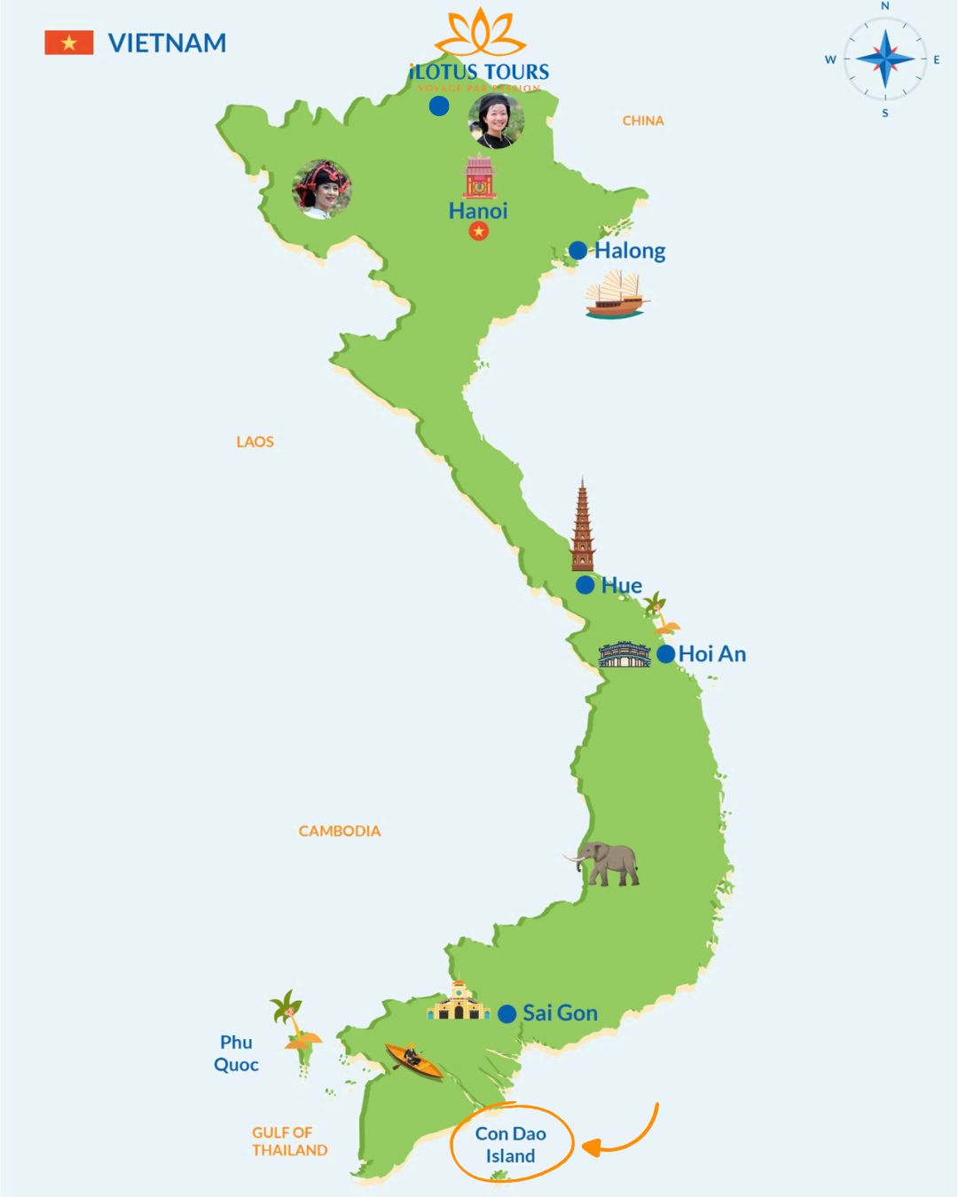 L’archipel est composé de 16 îles et îlots rocheux, mais seule l’île principale, Con Son, est habitée. C’est ici que se trouvent les hébergements, les infrastructures touristiques, les restaurants, mais aussi les principaux sites culturels et historiques.